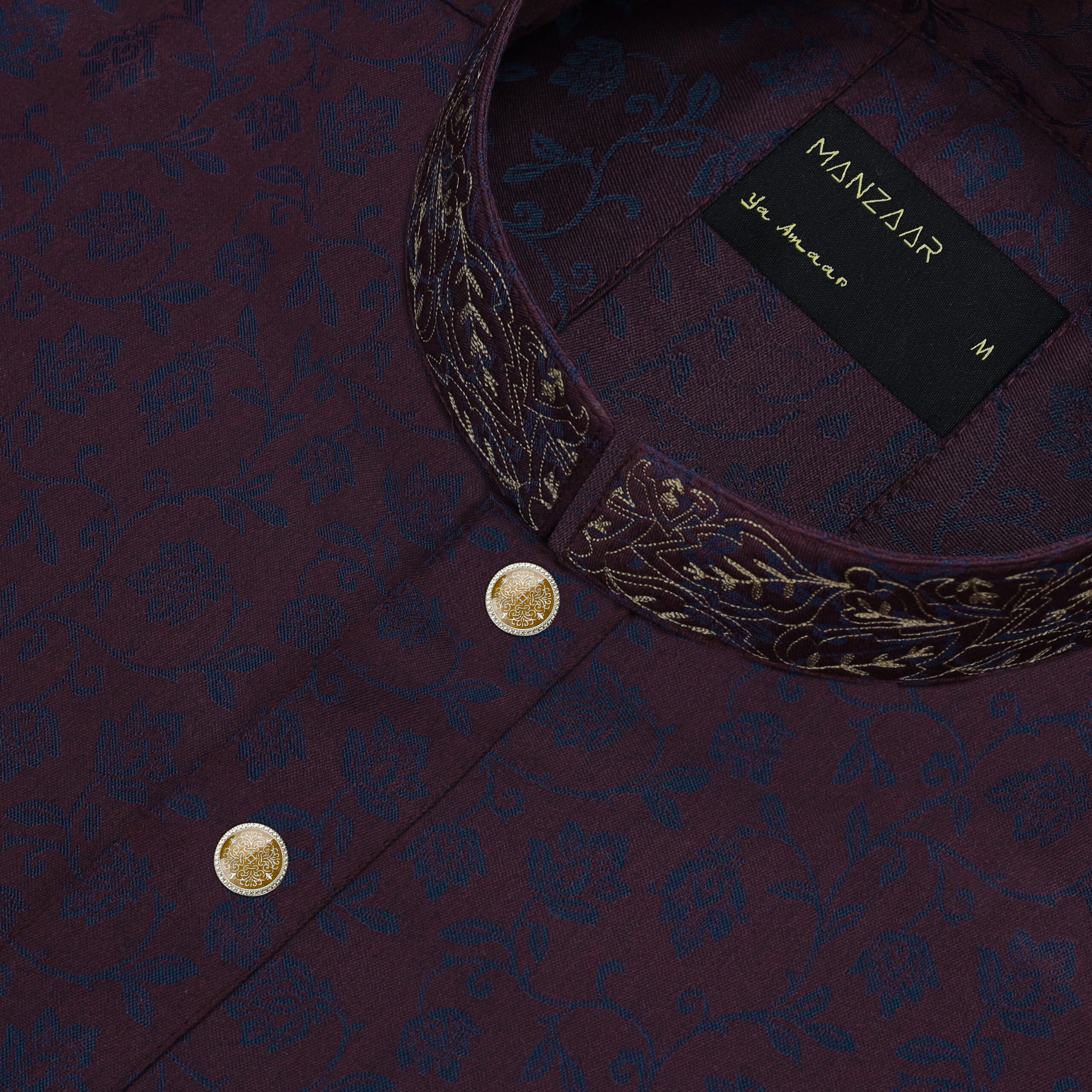 * Super fine Jacquard fabric with subtle Blue elements against a Maroon backdrop.